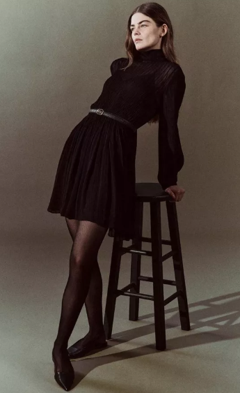 A sheer, crinkled stripe fabric imbues our mock-neck dress with mesmerizing dimension and movement. Take heed: we finished it with an elasticized waist for our signature touch of covert comfort.