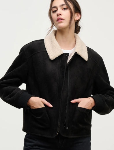 Crafted from ultra-soft faux luxe sherpa, this jacket delivers elevated warmth and everyday function. It features a full zip front with a concealed snap button placket, welt patch pockets, and ribbed trims at the cuffs and back hem for a clean, structured fit.