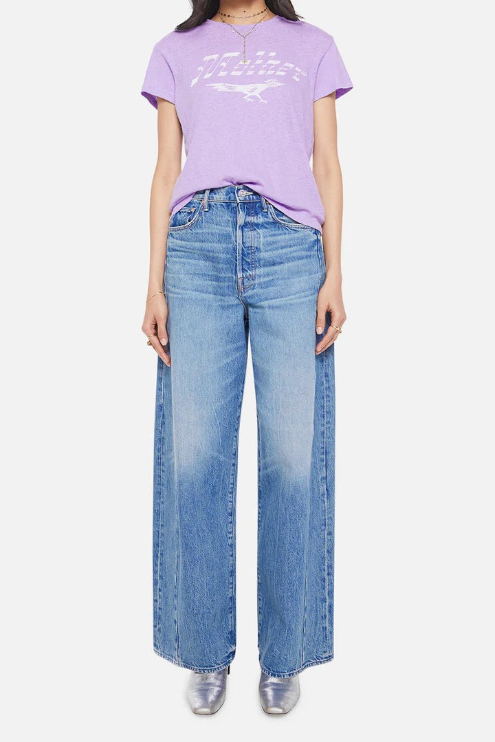 Catch me if you can. A soft crew neck with a slim fit for a vintage look and feel. Made from a SUPERIOR blend of cotton and linen in lavender, The Sinful in Roadrunner features a faded white graphic with text on the front.