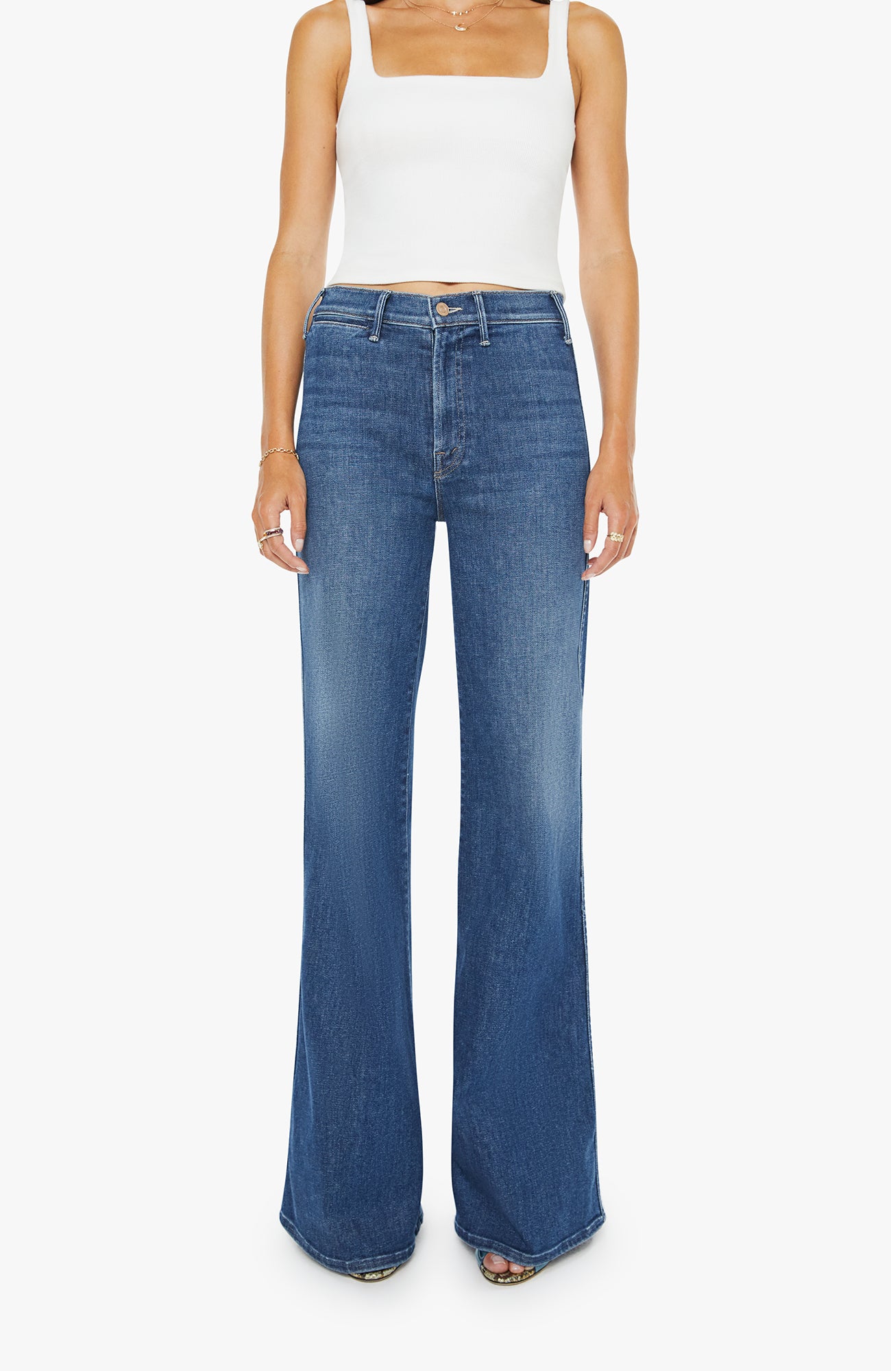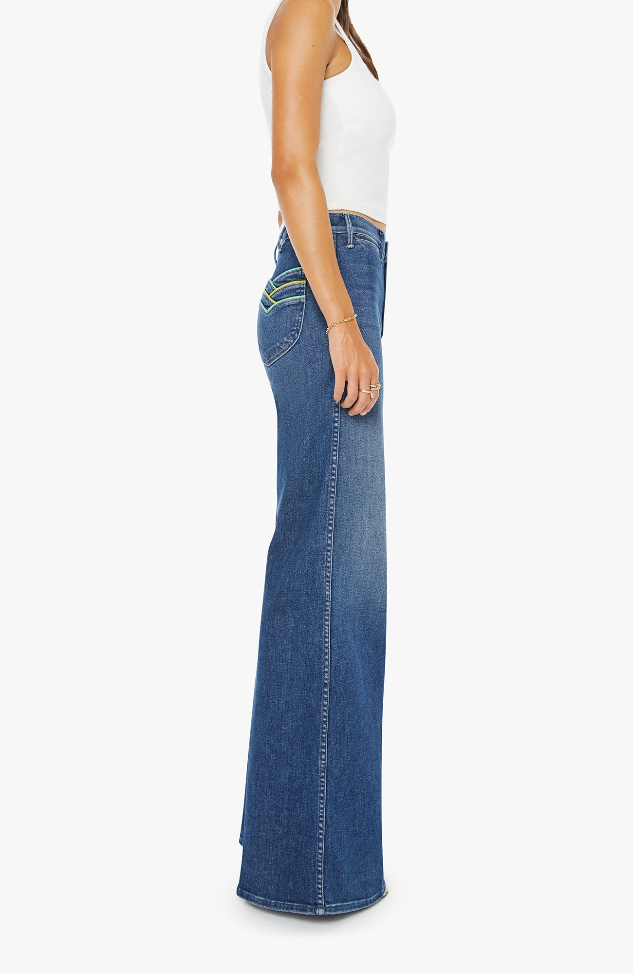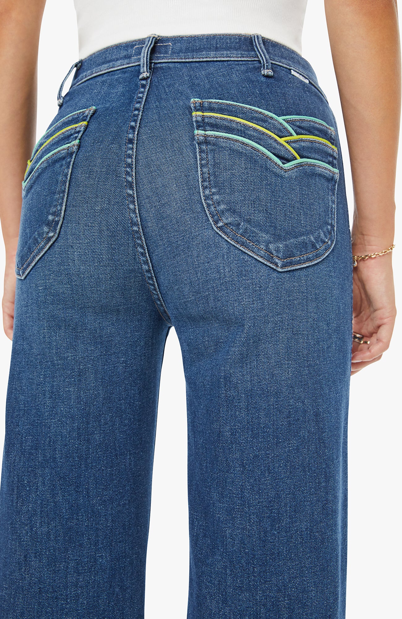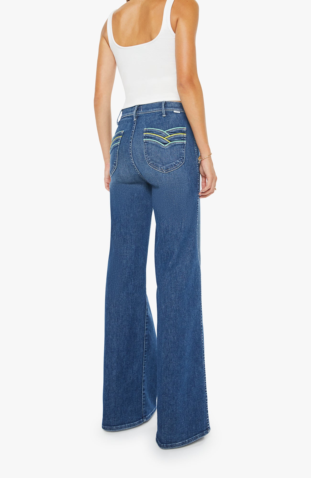 Get into the groove with these '70s-inspired jeans that boogie-woogie all night long in shape-retaining stretch denim with a high waist, wide legs and a just-starting-to-fade wash. The back pockets feature scalloped layers traced with colorful piping for an extra dose of throwback fun.