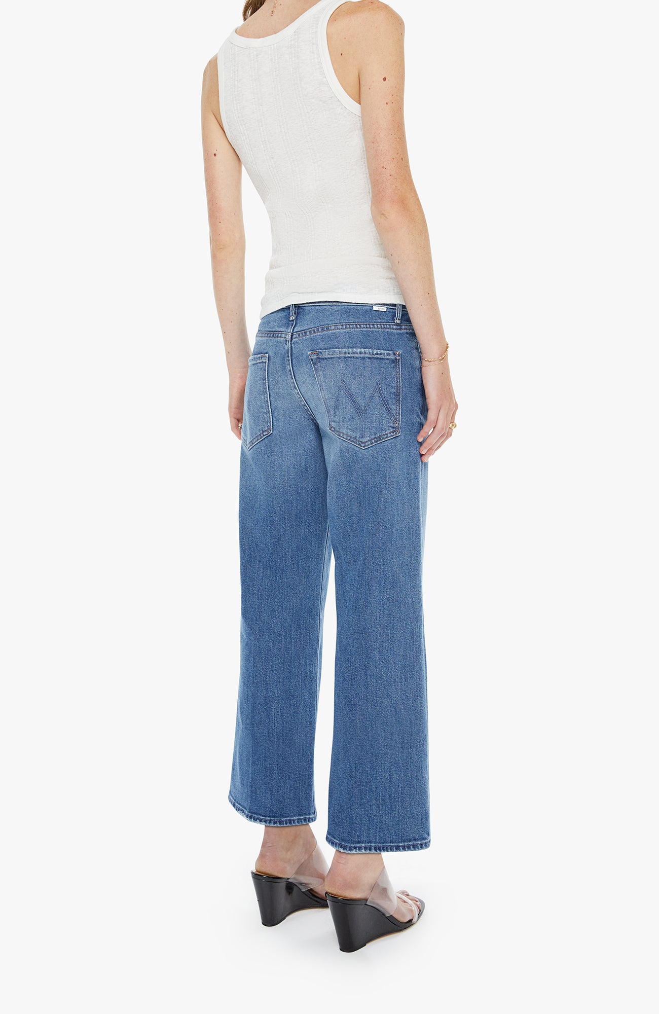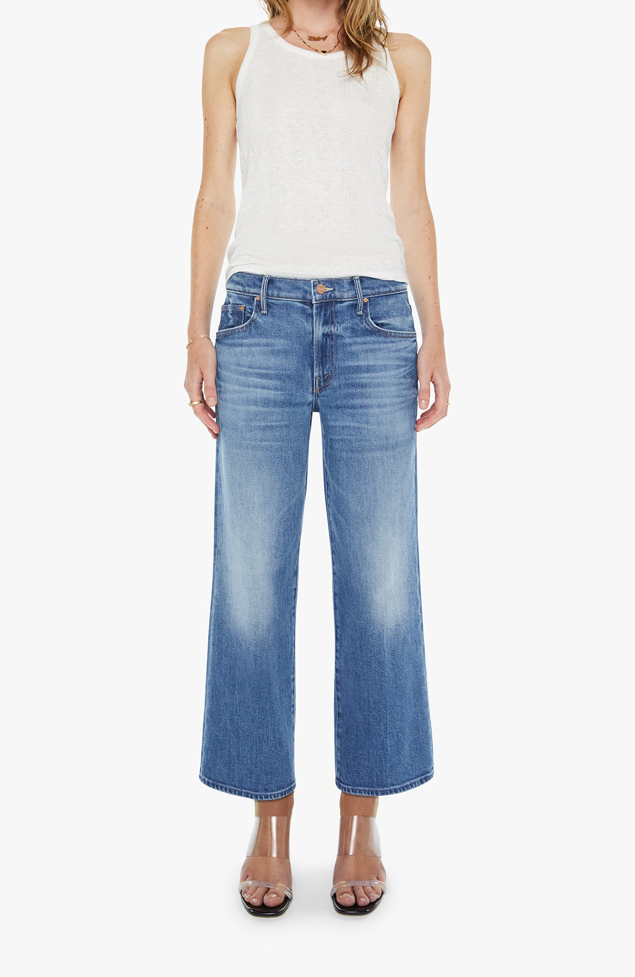 All in. Mid-rise jeans with a loose fit, wide leg, zip fly and ankle-length inseam with a clean hem. Made from stretch denim, All Your Eggs In One Basket is a mid blue with whiskering and fading at the knees.