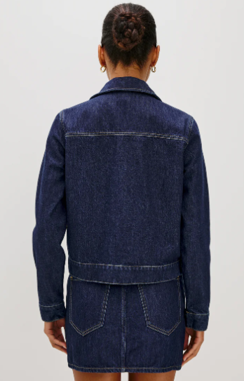 The Trabuco denim jacket features subtle Western influence with a contemporary feel. Details include a full two-way zipper, a Western-style yoke and chest pockets.