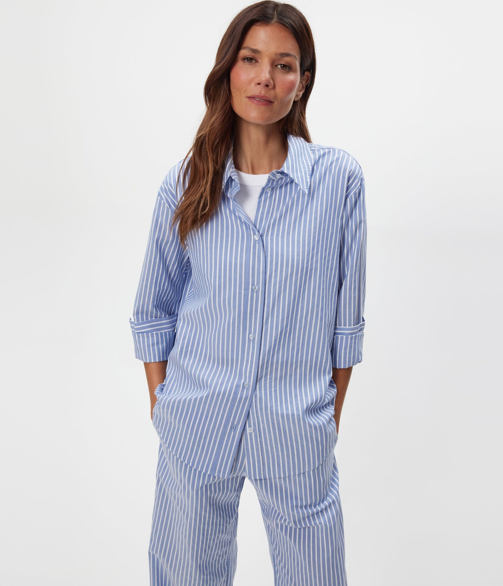 Crisp, cool and everything your wardrobe needs. The Carson is a classic poplin button down shirt with long sleeves and stripe detail. Made from 100% premium cotton, Carson is breathable, comfortable, machine washable and made in the US. Pair with the Taylor Wide Leg Pant for a complete look.