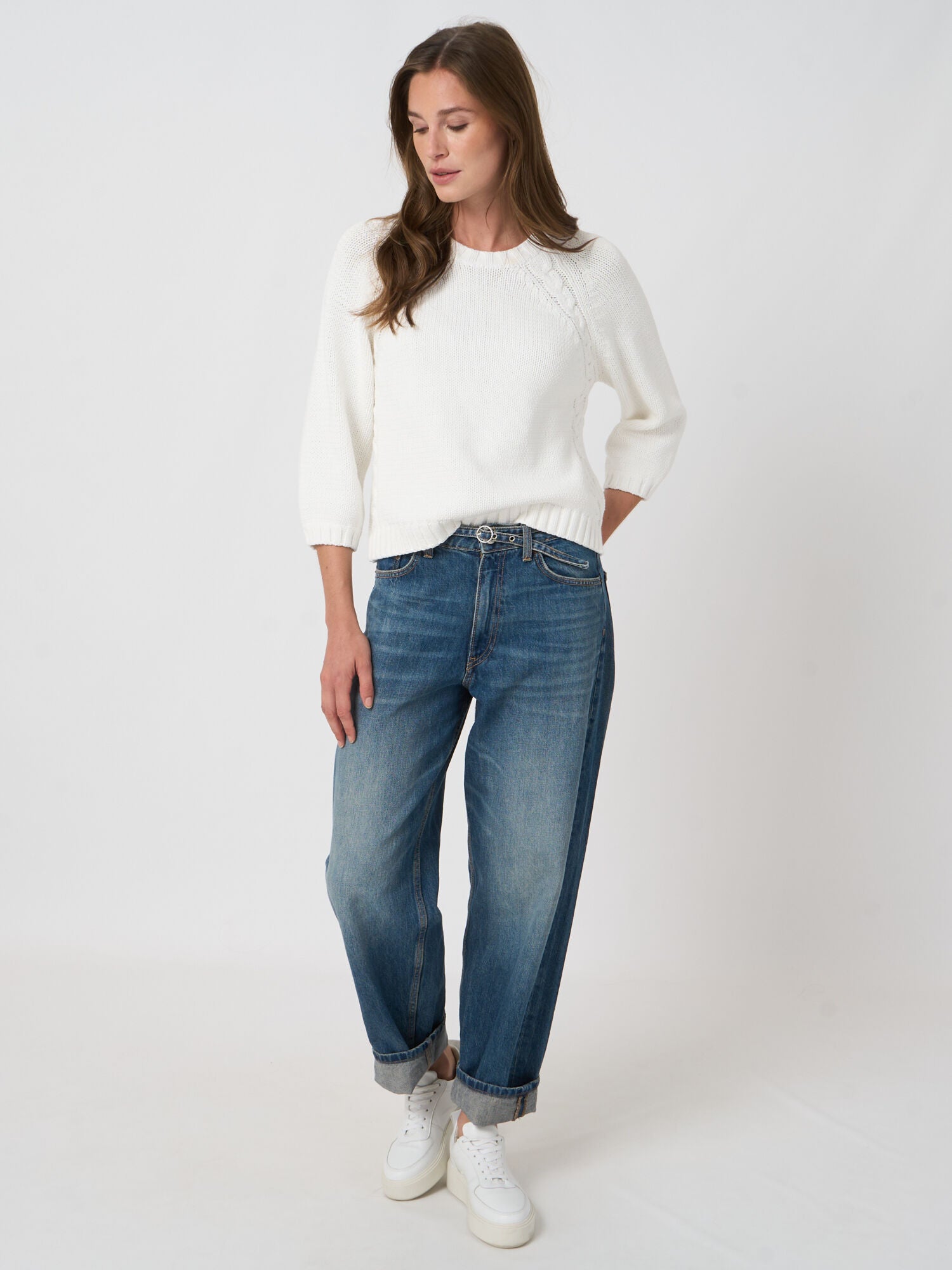 Spun from airy cotton-blend tape yarn, this chunky knit by REPEAT cashmere feels softly textured with a subtle large-mesh effect and cable-traced raglan seams. A loose regular fit and straight silhouette with 3/4 sleeves, ribbed crew neck, rib-knit hem, and side slits. Effortless everyday wear, ideal for layering.