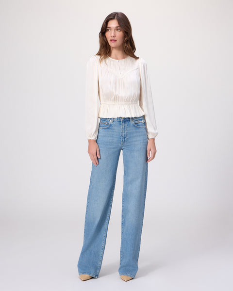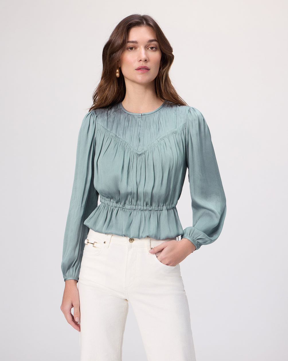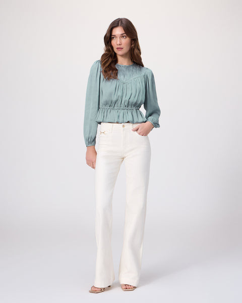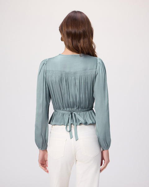The Gansevoort Top is crafted from eco matte satin in a soft antique white hue. Designed with long sleeves and elasticated details, this feminine silhouette features a flattering peplum hem, smocking in a V-shape at the front and across the back, and a tie detail that cinches the waist.