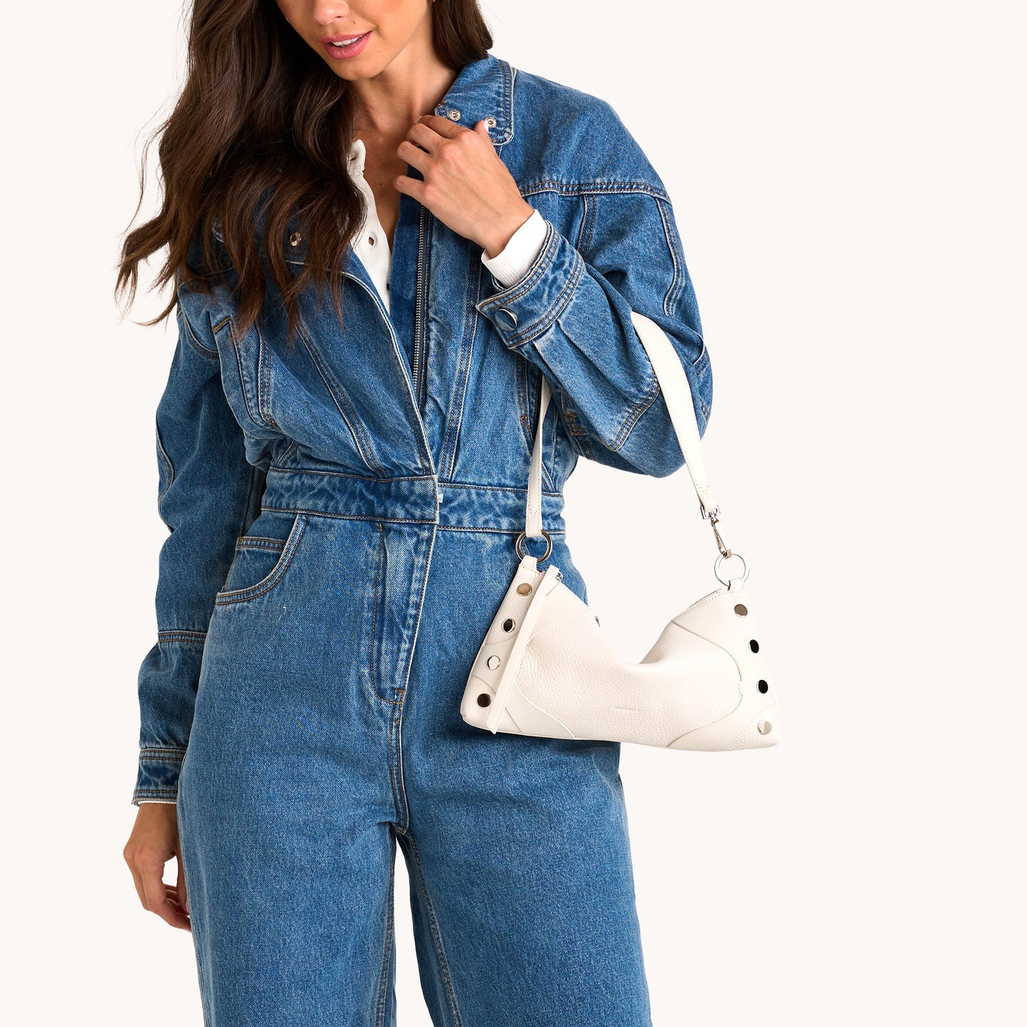 - Crafted with a bright, warm white pebble leather and a smooth, semi-veg tanned winter white leather panel caging treatment