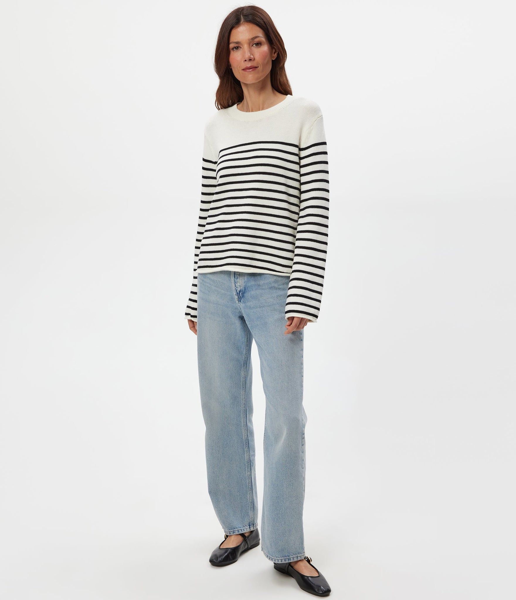 Mikaela is the sweater you’ll want to wear everyday. A crew neckline, long bell sleeves, relaxed fit, and fun stripe pattern make this pullover one you’ll keep in your rotation for seasons to come. Pair with denim, shorts, or your favorite tailored pants for a pulled together look.