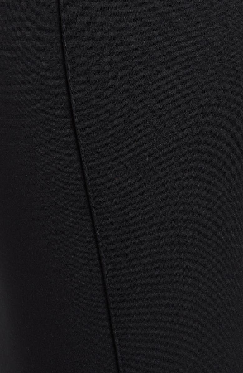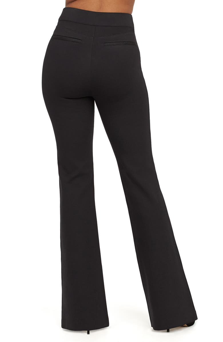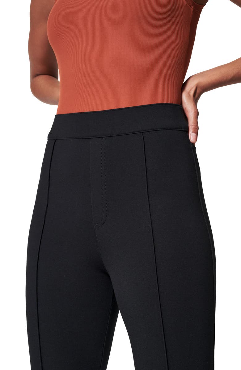 Smooth-fitting ponte fabric ensures the sleek look—front and back—of these pants with leg-elongating pintucks highlighting the fun, flared legs.