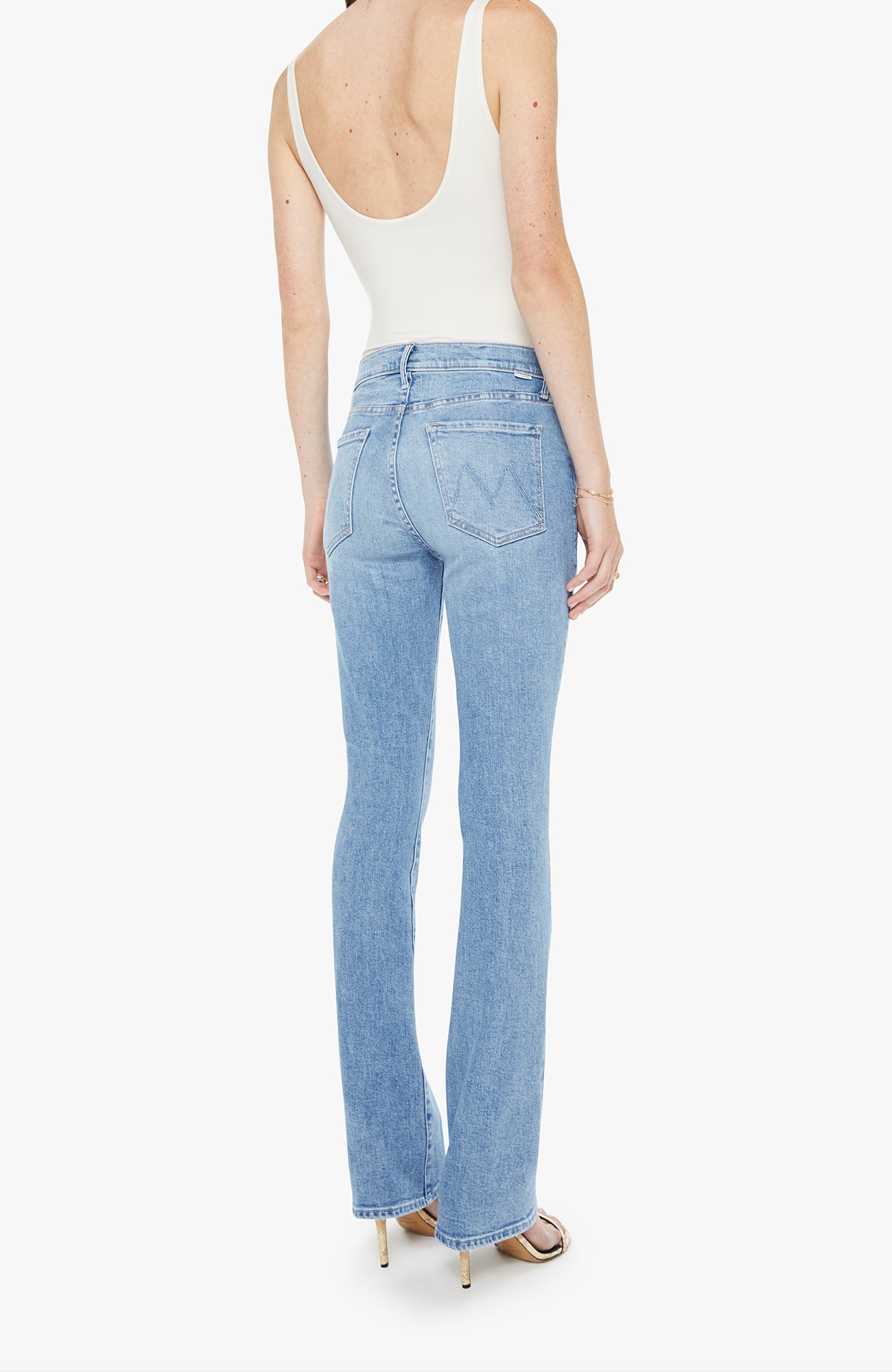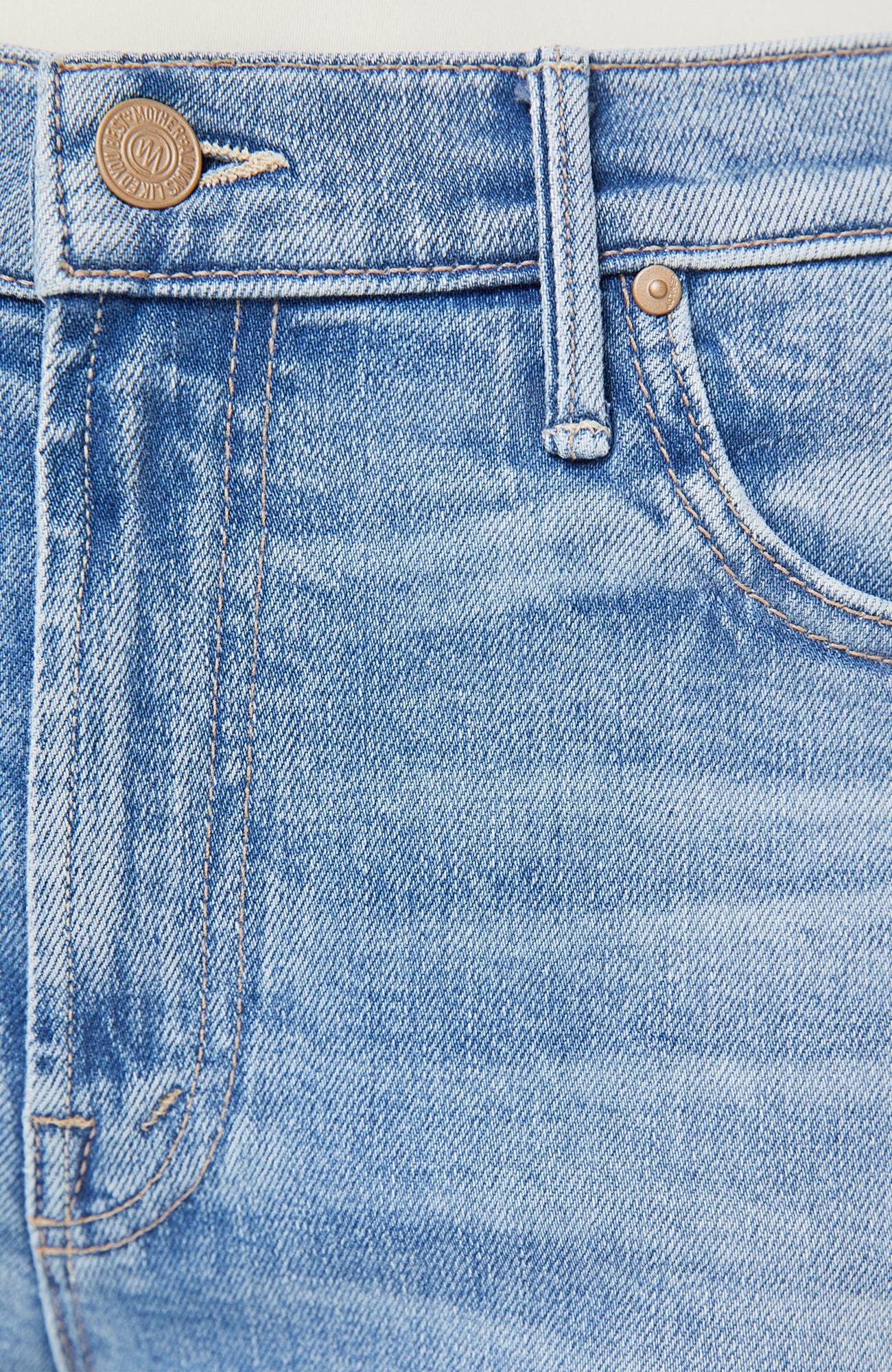 High-waisted bootcut jeans with a zip fly and a long 31-inch inseam with a clean hem. Made from denim with a touch of stretch, Baubles And Trinkets is a light blue with whiskering and fading at the knees.