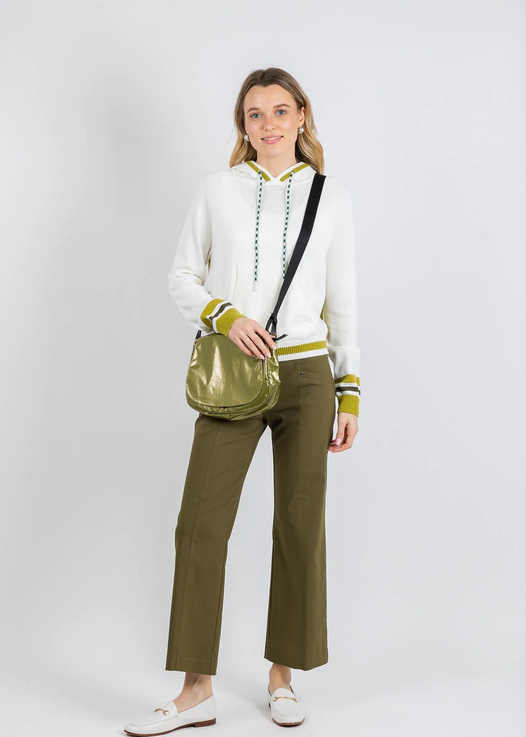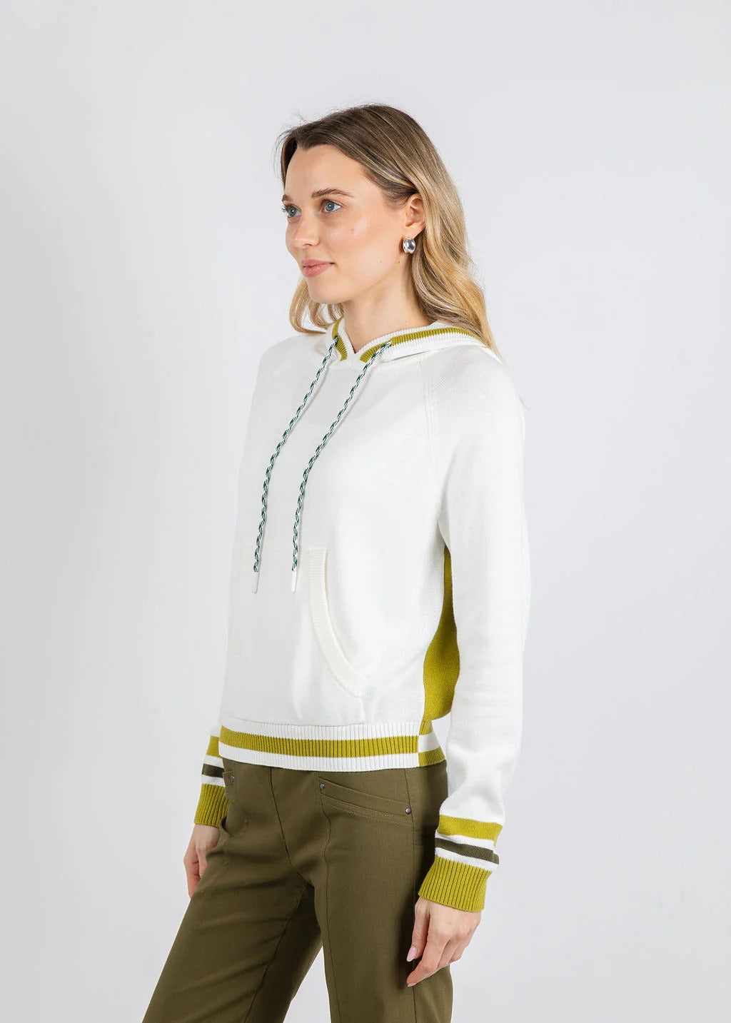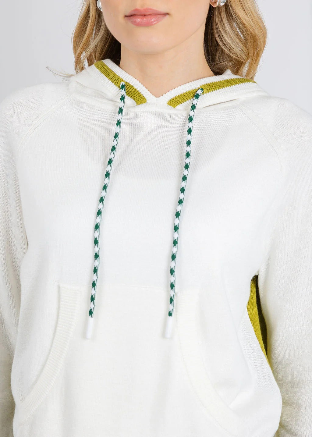 Stay cozy in style with Whisper by Brodie's Contrast Stripe Varsity Hoodie that blends classic comfort with modern edge. The attached hood features adjustable drawstrings for a customizable fit, while the spacious kangaroo pocket keeps your hands warm and essentials within reach. Long sleeves provide full coverage, complemented by ribbed cuffs and hem for a polished finish. Plus, the eye-catching contrast stripe accents and a striking colorblock detail at the back elevate your casual look from ordinary to standout. Perfect for layering or wearing solo, this varsity-inspired sweater offers versatile appeal for any season.