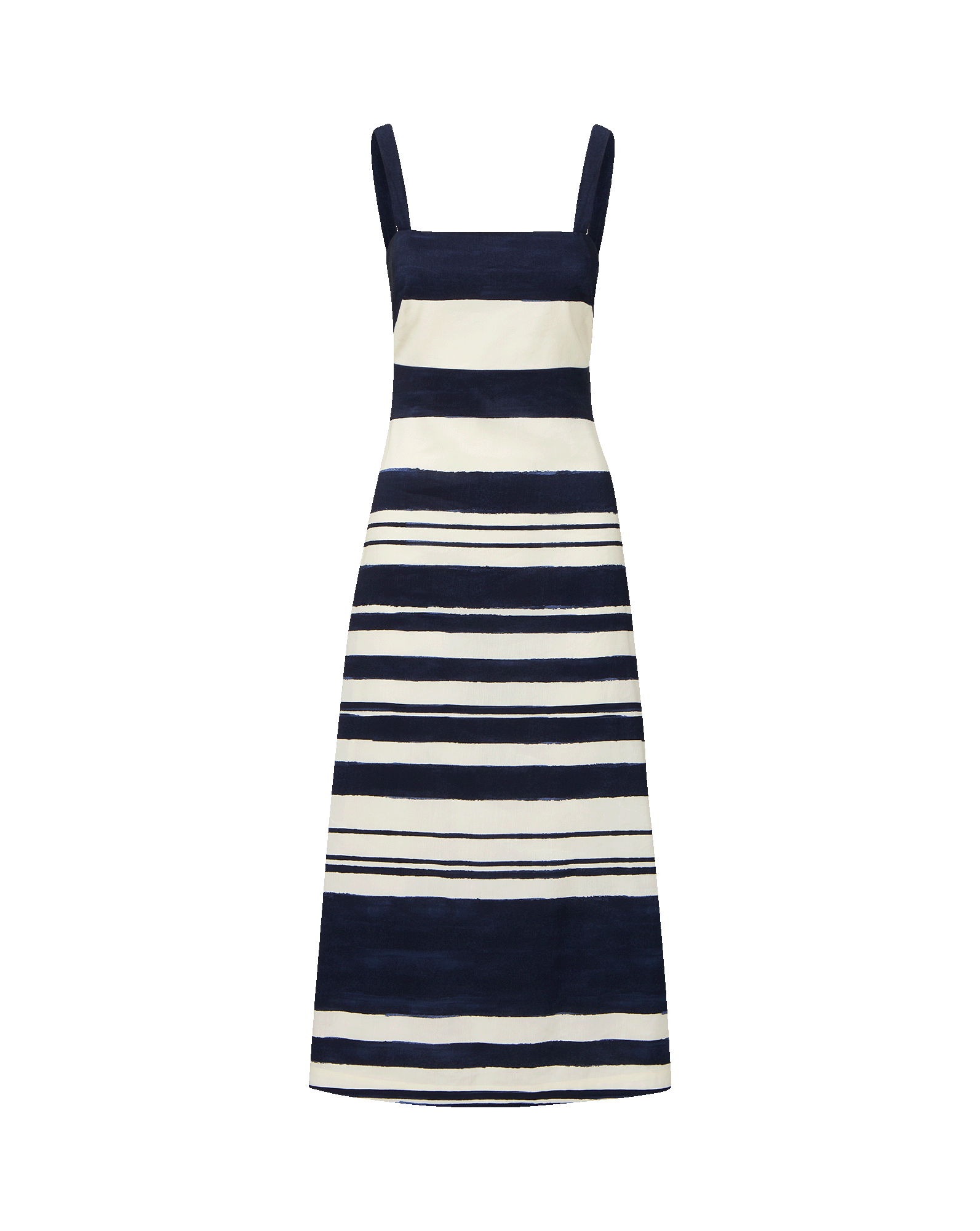 The essential spring dress. Crafted from a crisp linen blend, the Ella midi dress is cut in slim A-line silhouette and features navy-and-white stripes with a hand-painted look. Wide, adjustable shoulder straps create a square neckline, and are finished with shell buttons for subtle dimension. Perfect for date nights and weekends around town—just add a sandal and go.