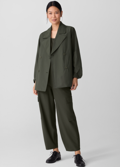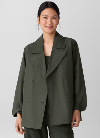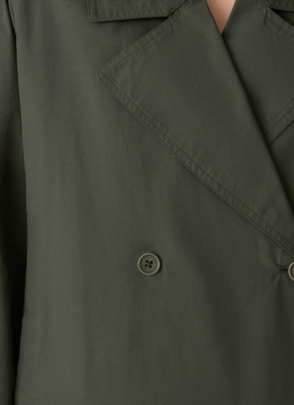 A modern take on a timeless shape. The trench coat with a button front and short silhouette, in a sporty cotton weave made with recycled nylon.