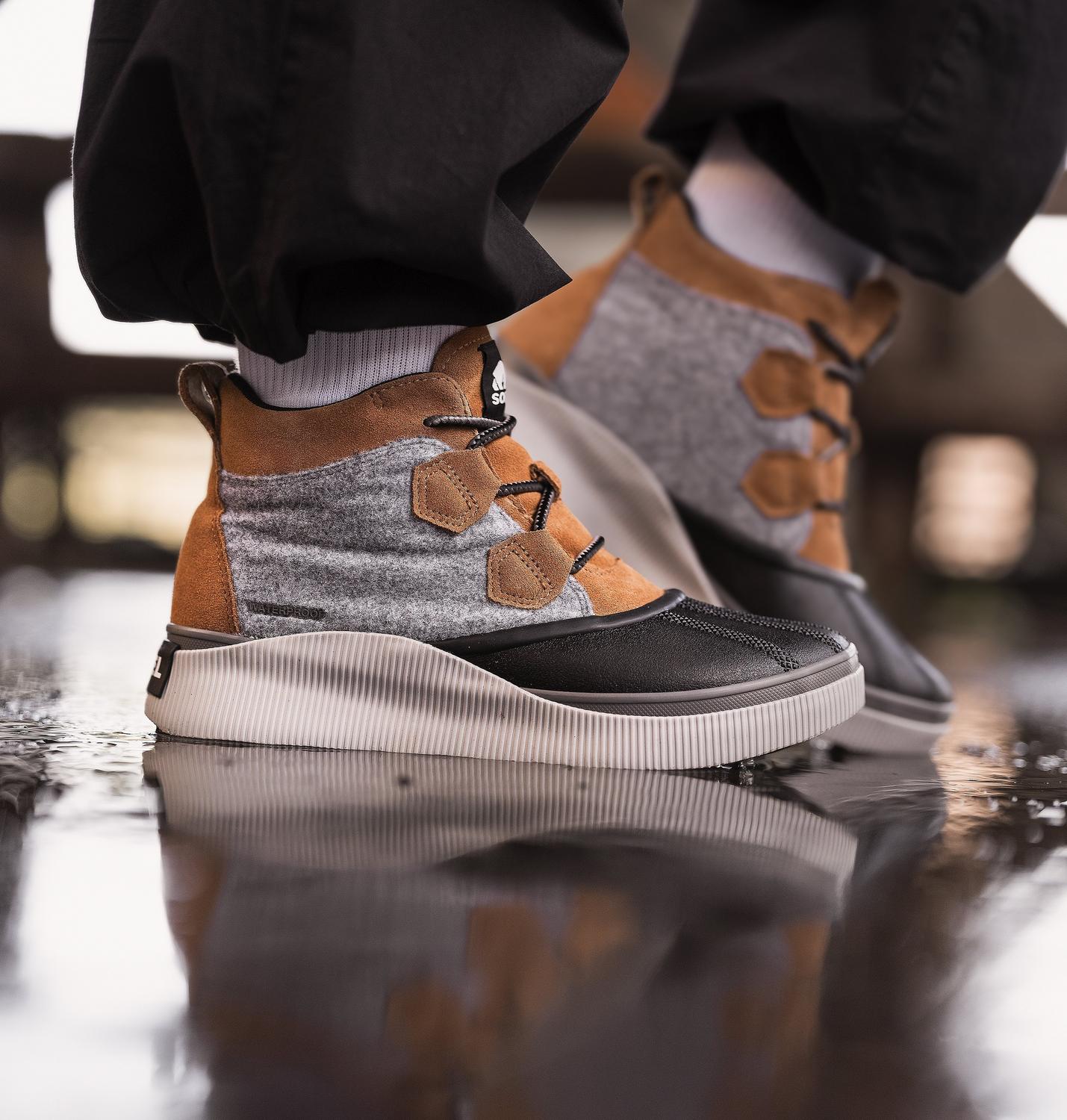 - UPPER: Waterproof materials. Full grain leather and suede upper, felt and suede upper or suede with houndstooth textile. Heel pull tab. Lace closure. Textile lining. Waterproof bootie construction. Waterproof vulcanized rubber shell. Laces are not waterproof.