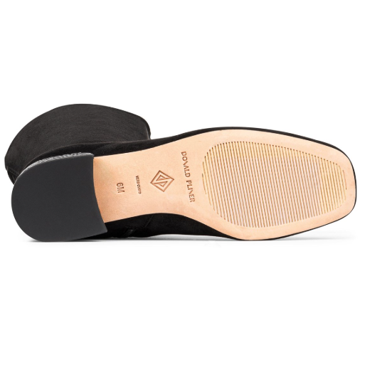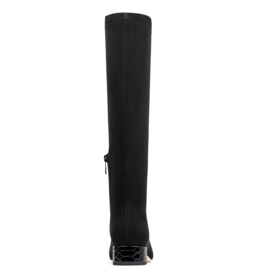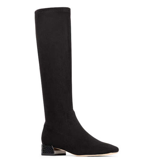 With a clean modern look, the DOLORES boot in stretch suede molds to the leg and has an inner zip closure that makes it easy to slip on and off. The sleek silhouette is accented by a low snake print block heel with metal plated detail. Finished with a memory foam insole for total comfort and a buffed leather outsole.