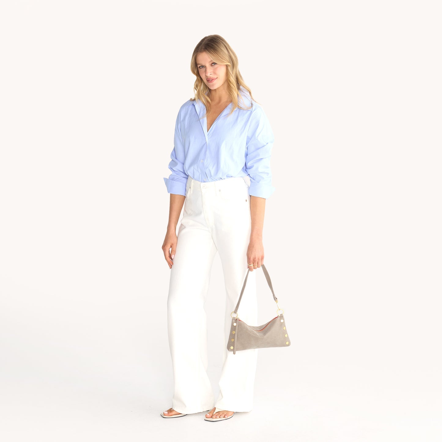 This fresh, of-the-moment bag is a must-have companion for nights on the town. Featuring a slouchy but current shape, in our classic pewter leather, this versatile little number transitions from a wristlet to a shoulder bag in seconds flat. The Kyle also includes a removable and adjustable crossbody strap, so you can go hands-free and allows the Kyle to be worn 3 different ways depending on your look!