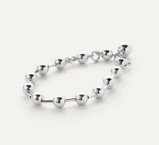 Luminous metal spheres that make for a modern take on a beaded bracelet. This stackable design includes three non-removable extender rings, making it easy to wear at three different lengths. Finished in high-polish silver.