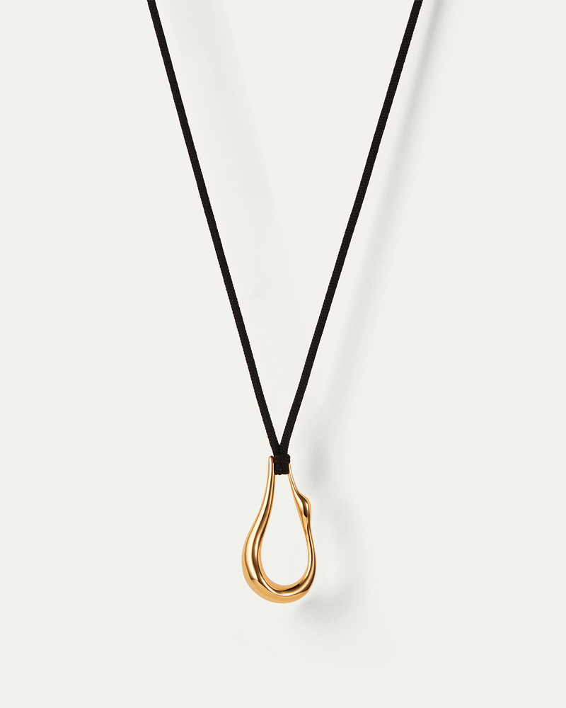 The egret bird's elongated neck is featured in profile on this rope pendant necklace. The pendant is finished in high-polish gold and hangs from a black cord made of recycled polyester.