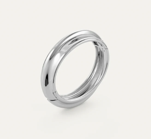 An organically-shaped bangle that boasts deep contours. This custom bracelet opens and closes with a hinge and tab lock closure. To open, push down on the highest point of the clasp before pulling the bracelet open. To close, listen for a "click" to ensure tab is locked properly.