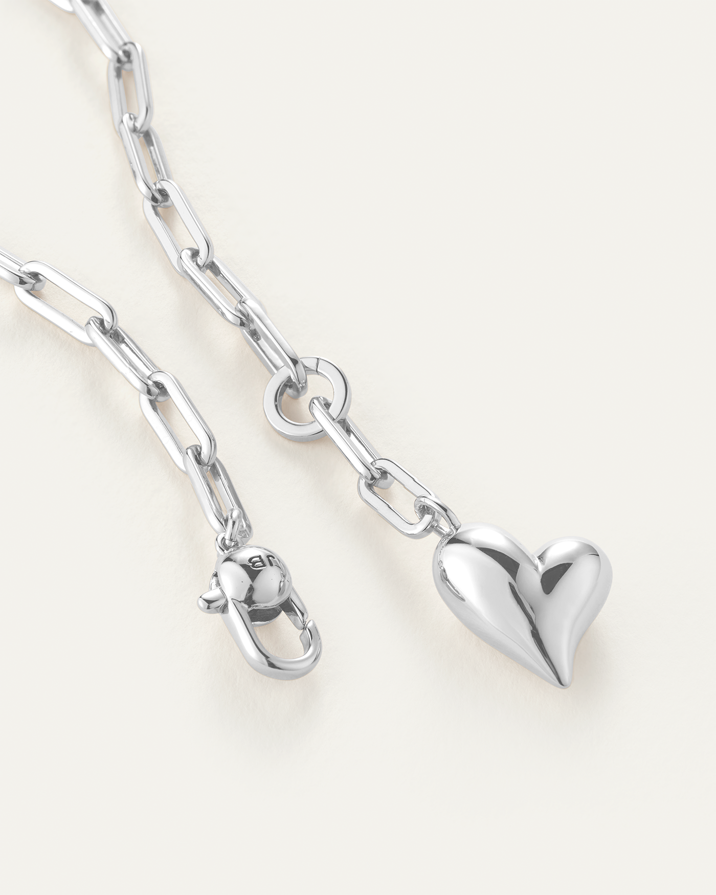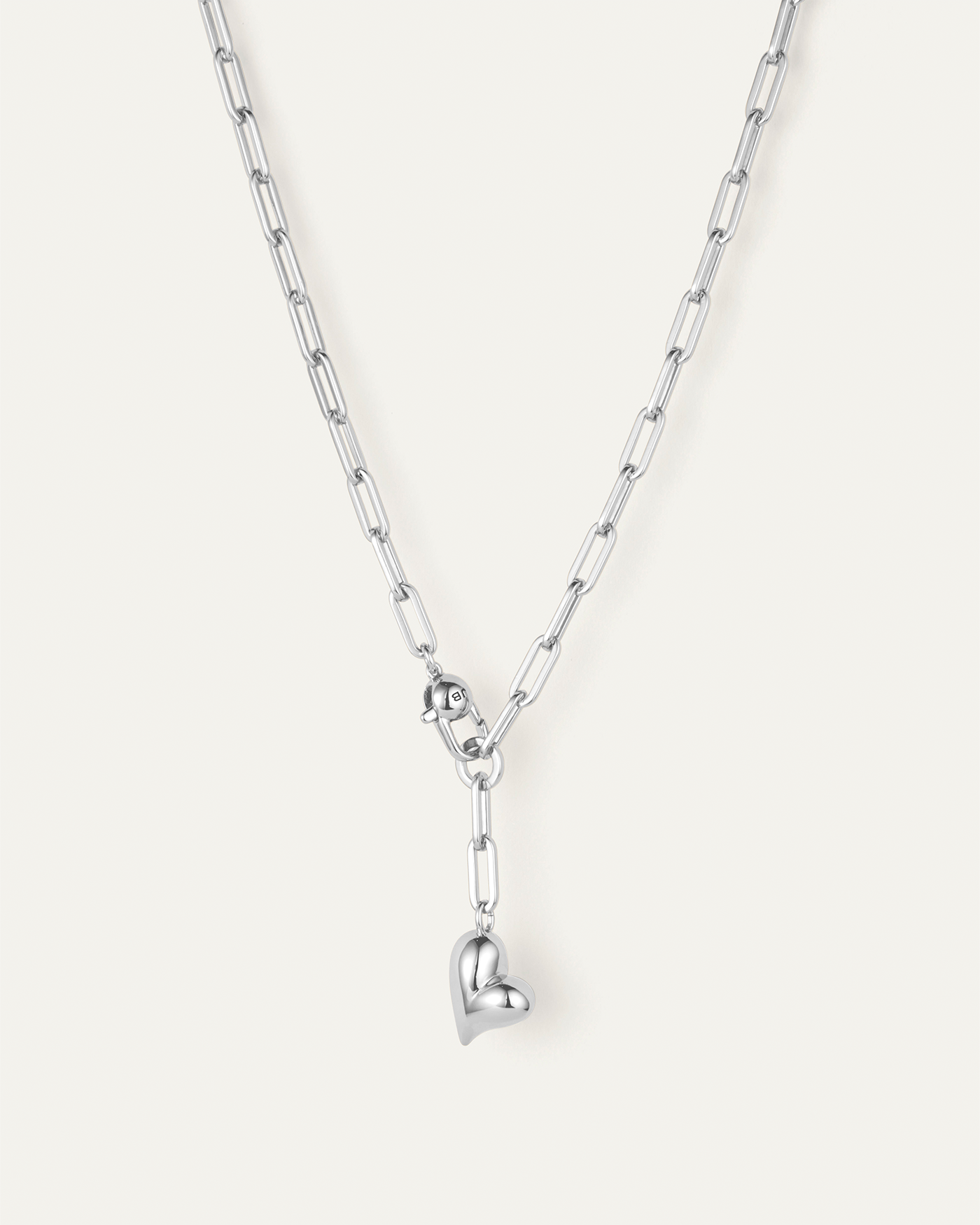A joyful, inflated heart is suspended from a paperclip link chain necklace. Finished in high-polish silver.