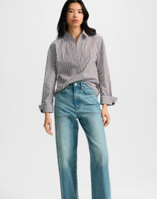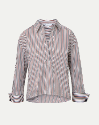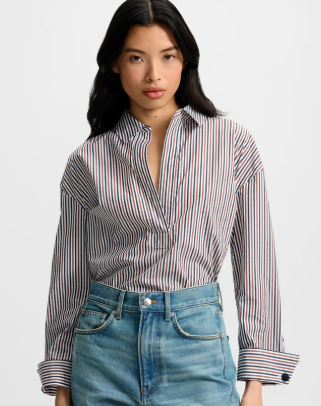 The staple every closet needs. The crisp structure of a classic button-down is reimagined in the Draymond—a split-neck blouse crafted from premium stretch cotton. It features a sharp point collar and a clean, buttonless placket for a modern take on timeless shirting. Pre-cuffed sleeves and a high-low shirttail hem complete the look. Effortlessly versatile, pair it with denim for everyday ease or dress it up with a maxi skirt.