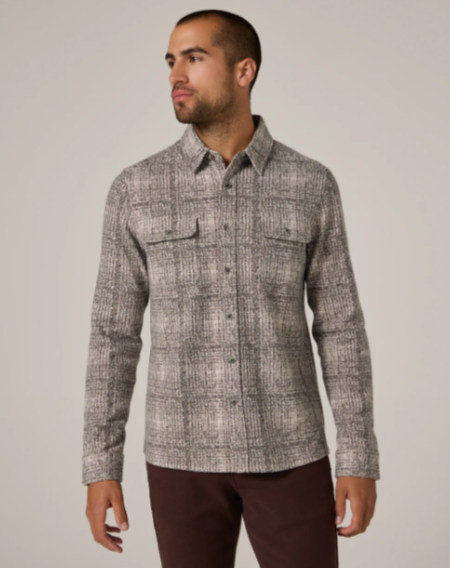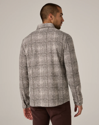 This soft-touch, double-knit jacquard shirt pairs a designer-made plaid pattern with 4-way stretch for all-day comfort. Finished with chest flap pockets, faux-horn buttons, and a curved hem for a clean, tailored look.