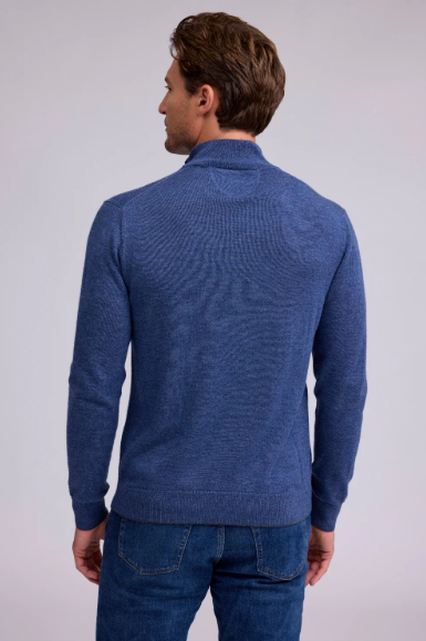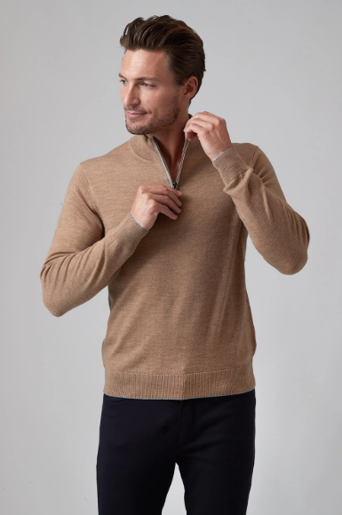 The Palmer is our elevated zip mock neck sweater with subtle tonal trim detail on the placket, hem, and cuff, and designed in 100% Extrafine Merino Wool. Style with any of our cotton-blend pants, Theo, Jasper, or Howard, for a contemporary look that will get you noticed.