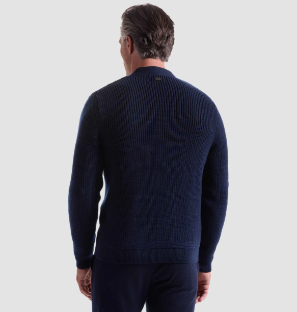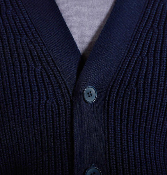 Crafted from 100% extrafine Merino wool, this cardigan features a textured rib knit for a refined, structured look. The ribbed hem and cuffs are enhanced with a distinctive patterned detail for added dimension. Designed with a V-neckline, button-front closure, and a classic fit, it's a versatile layering piece that effortlessly balances warmth and sophistication.