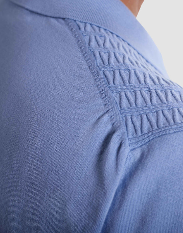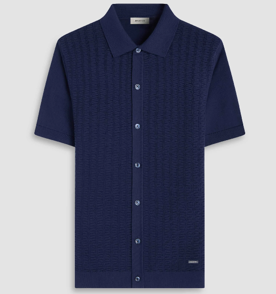 Crafted from a refined cotton-blend, this sweaters features a textured ladder stitch design across the front, complemented by a plain knit back. Short sleeves and a full button closure with mother-of-pearl buttons add a refined touch. Finished with ribbed collar, cuffs, and hem for a polished yet relaxed look.
