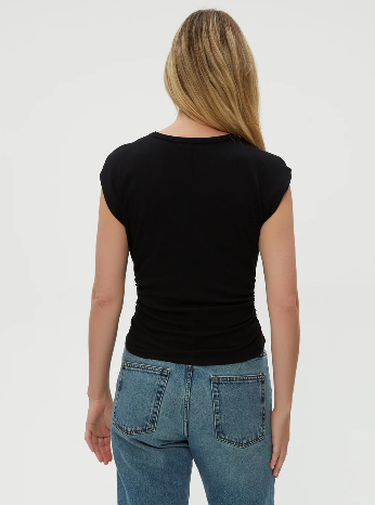 Extended shoulders add on-trend structure to this sleeveless ribbed top designed with curve-hugging ruching at the sides.