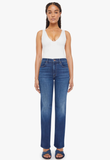 A high-rise straight leg jean with a zip fly, 31.25-inch inseam and a clean hem. Made from a blend of recycled stretch denim, Troublemaker is a mid-blue with whiskering and fading at the knees.