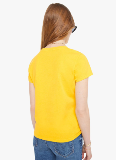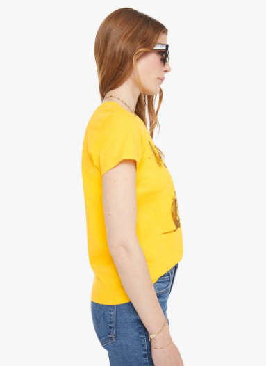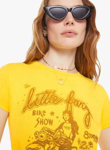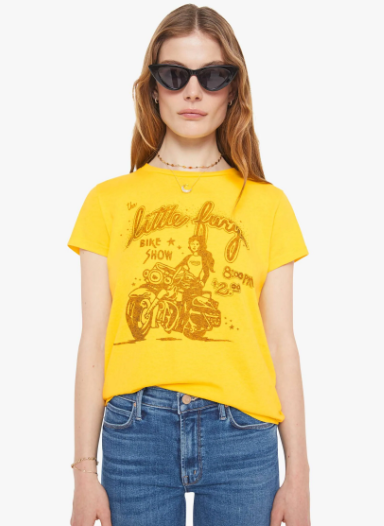 Hell on wheels. A soft crewneck with a slim fit for a vintage look and feel. Made from 100% supima cotton in bright yellow, the tee features a bike show graphic in tan on the front.