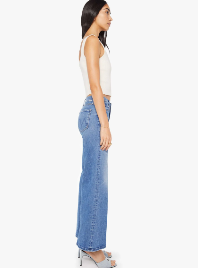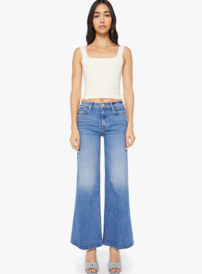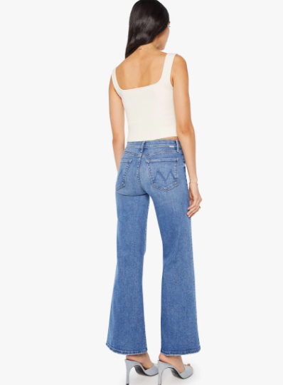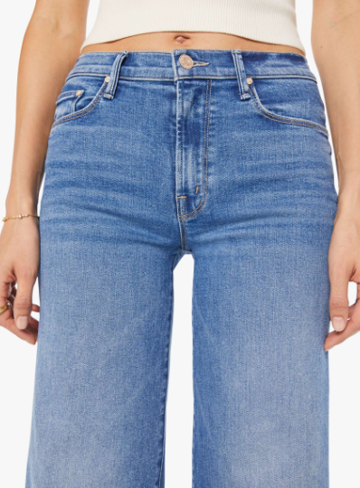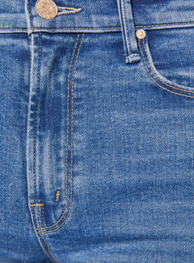 Strike three. High-rise pants with a flared, wide leg and 31-inch inseam with a clean hem. Cut from super stretchy denim, Swing And A Miss is a mid-blue with whiskering and fading at the knee.
