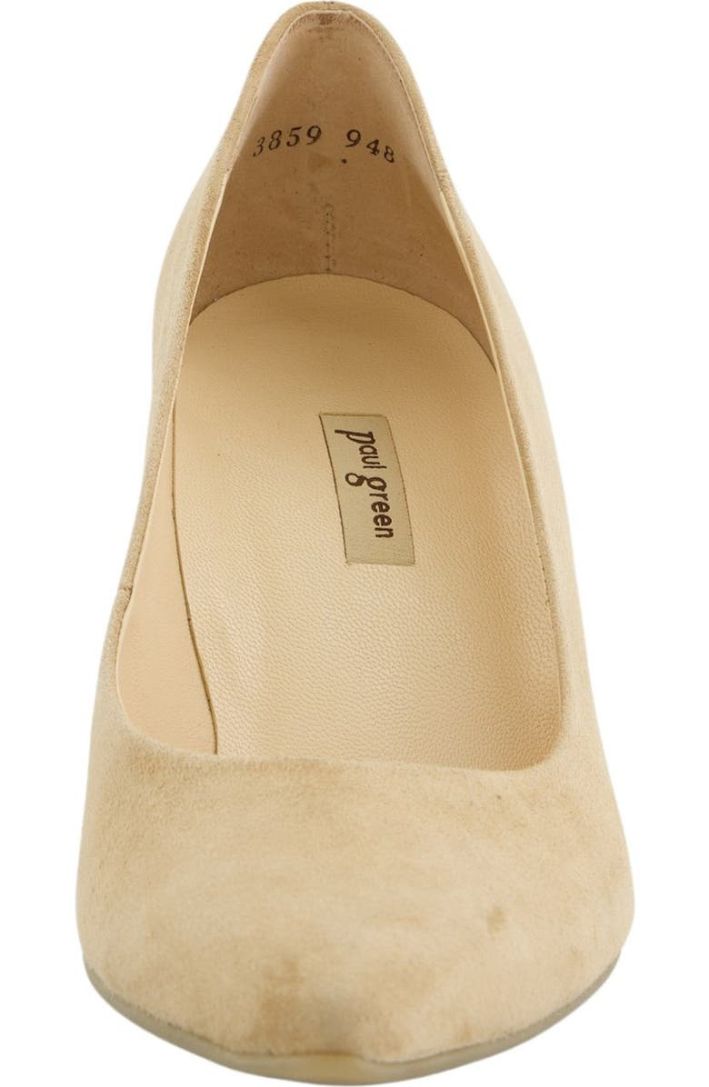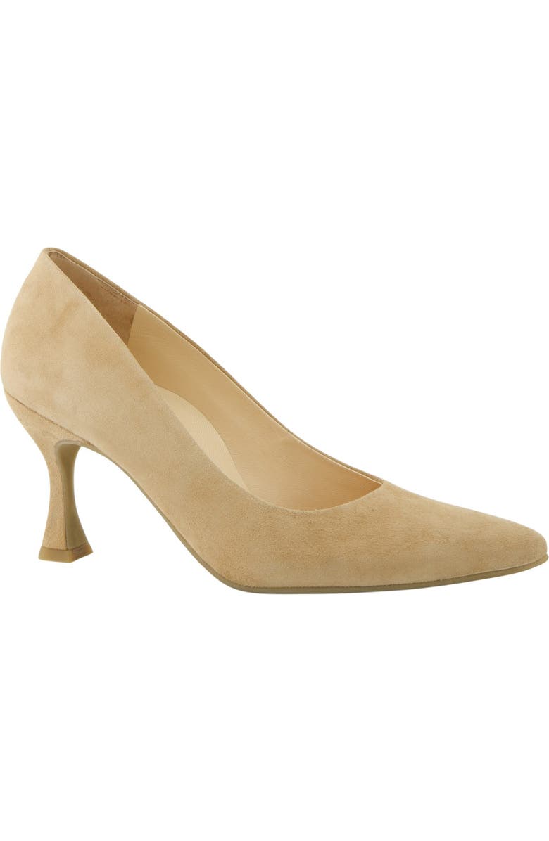 A pointy toe elongates the streamlined profile of a sleek leather pump set on a cushioned footbed and modest flare heel for walkable comfort.