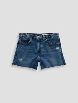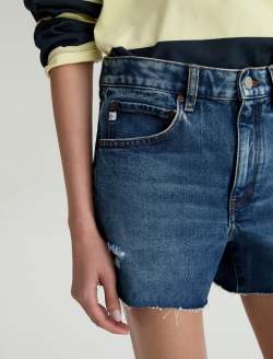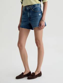 Halle is a high-rise short crafted from Premium Left Hand Denim. With a waist-defining silhouette and relaxed fit, this denim short pairs perfectly with everything from tucked-in tees to cropped tanks. Designed in our medium blue wash, 11 Years Enrich, and finished to emulate 11 years of AG-ed™ wear through front distressing, whiskering, fading, and vented raw-cut hem.