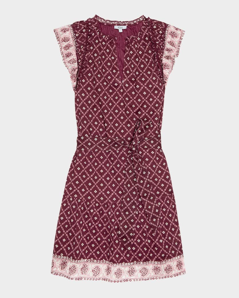 The Katia is an airy, lightly textured poplin mini dress featuring shirring, lattice, and ruffle trim at the shoulders, flutter sleeves with contrast stitching, adjustable belted ties, and a fully lined tiered skirt.