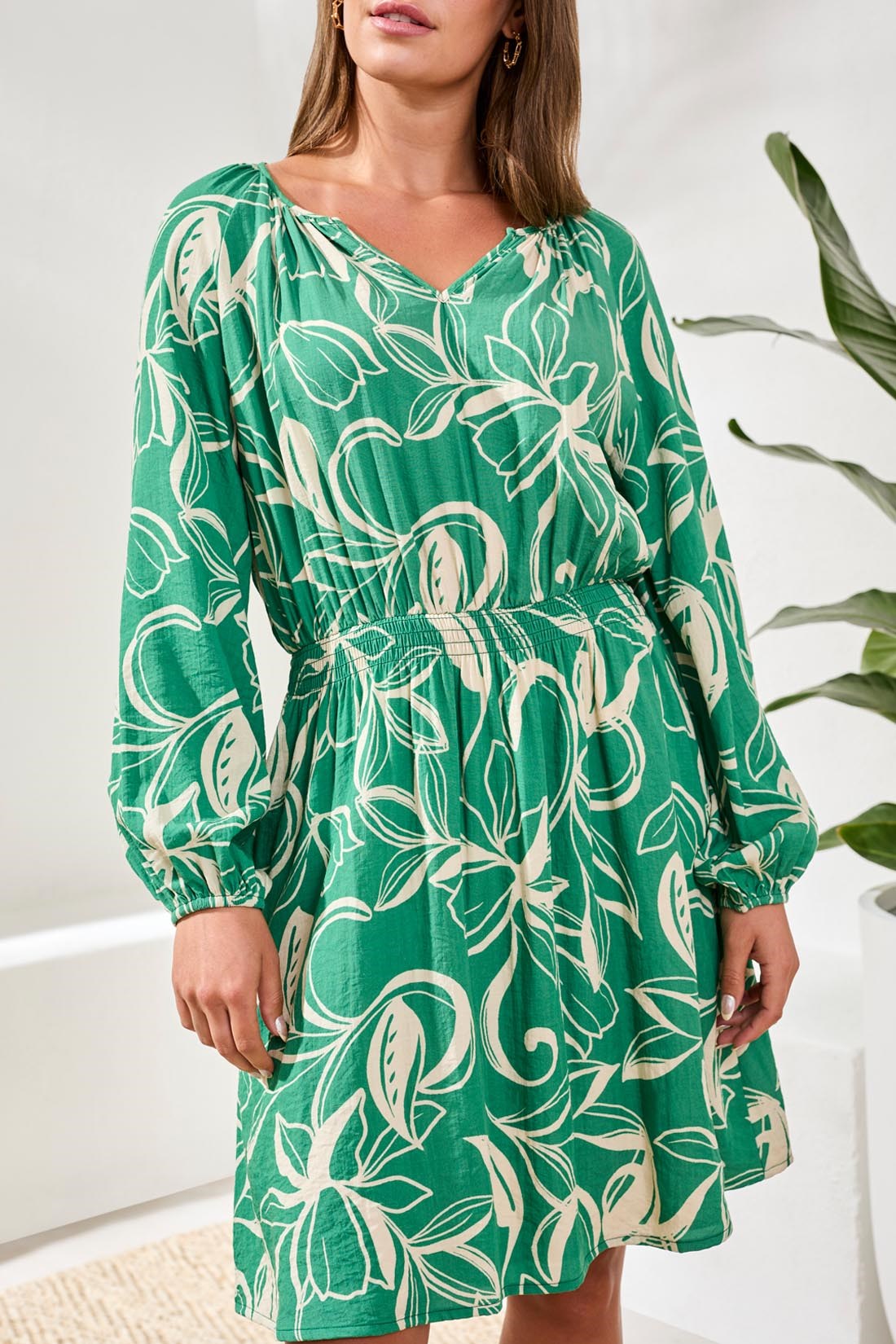 Printed V-Neck Balloon Long Sleeve Fitted at Waist Dress
