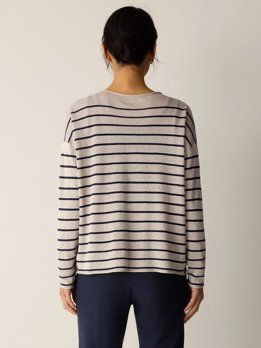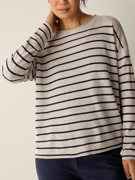 The jewel neck top. An effortless layer set apart by sophisticated stripes, in a textural blend of organic linen and cotton.