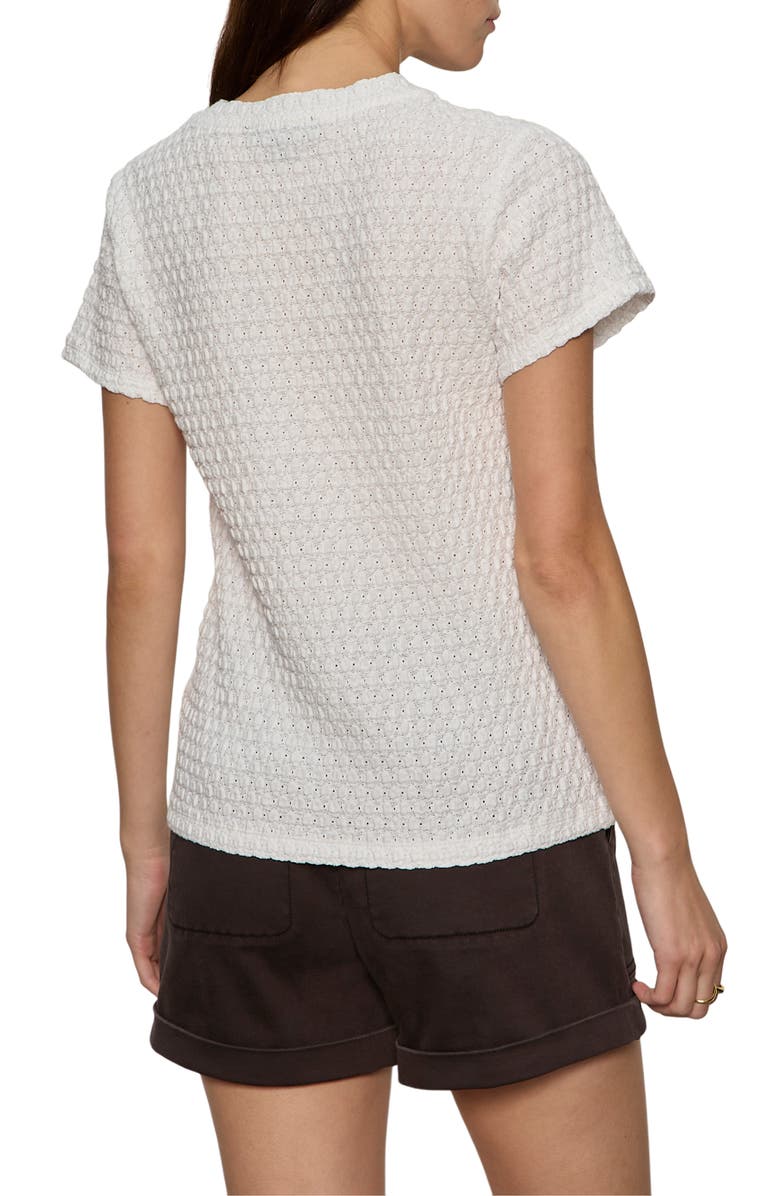 An airy pattern brings breezy style to this stretchy T-shirt made from puckered lace.