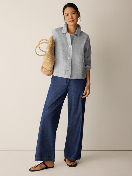 A refined jacket to take you from this season to next. Designed with a classic collar and welt pockets, in a striped organic linen weave with a hint of sheen.