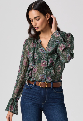 The Claude Blouse is crafted from 100% silk flat georgette in a deep emerald green and pink medallion print. This vintage-inspired silhouette features a button front and a double-layer cascading ruffle necktie. Finished with soft puff sleeves and elasticated ruffle cuffs, it’s a romantic take on a timeless statement blouse.