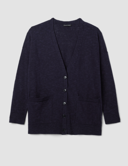 A lightweight layer that goes with everything in your closet. The V-neck cardigan with patch pockets and ribbed trim. In a seasonless blend of organic cotton and organic linen.