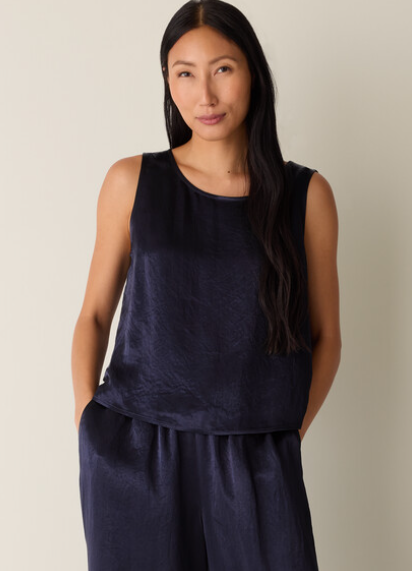 Simply sophisticated. An elegant ballet neck tank in a lustrous satin weave with crinkled texture. Made in a Fair Trade Certified™ factory