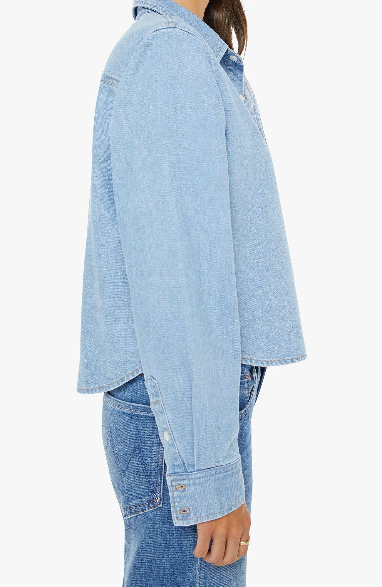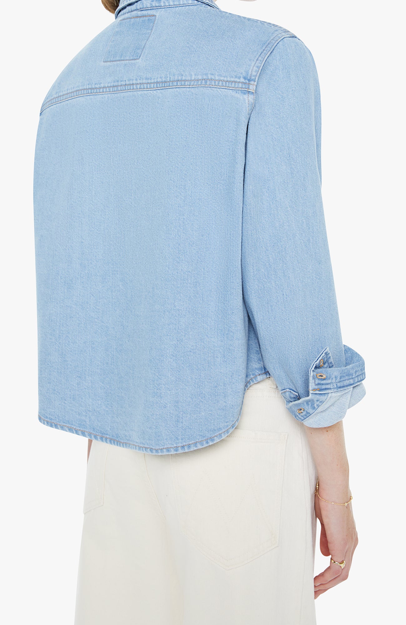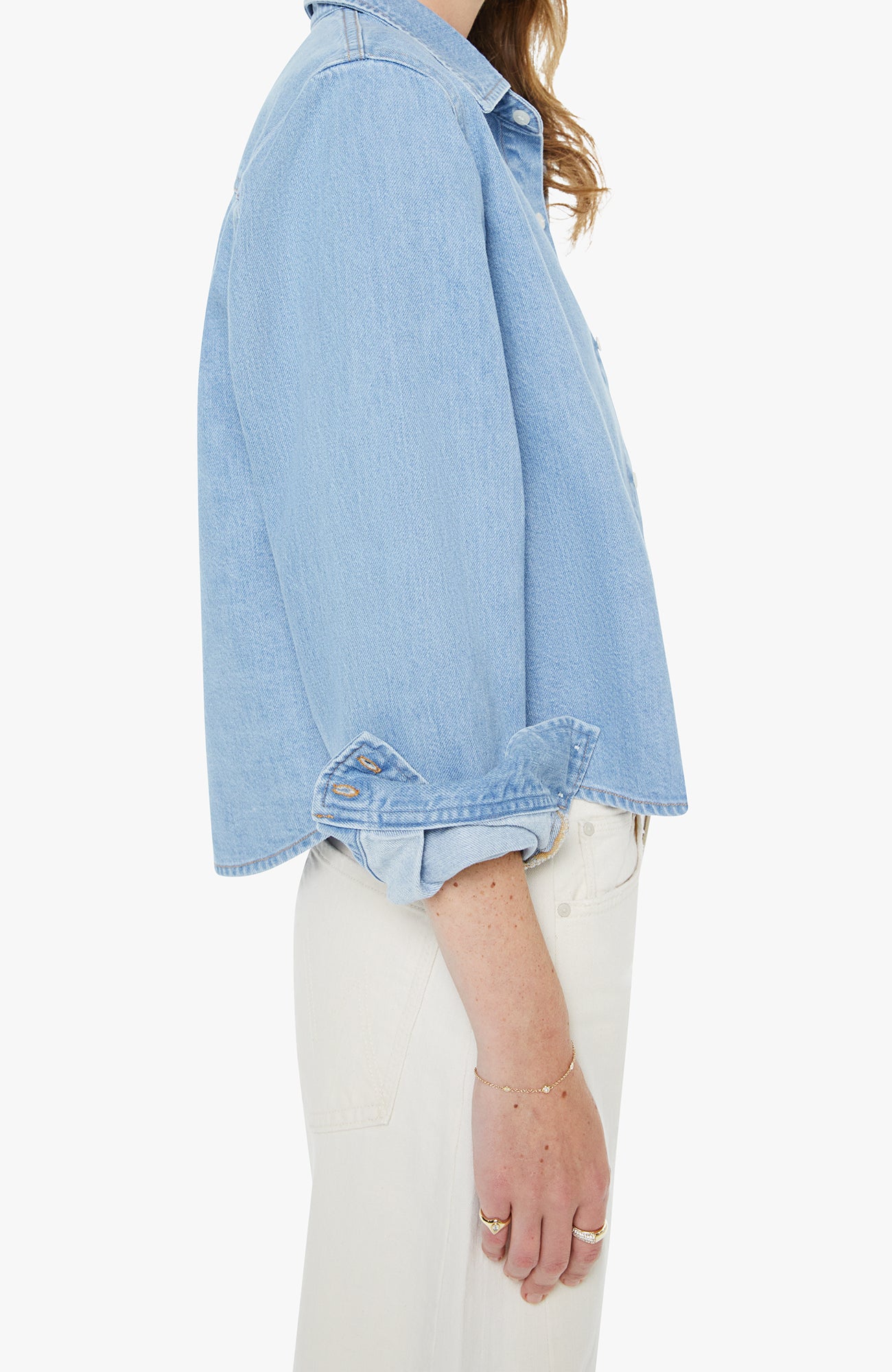 An expanded collection of foundational pieces designed for All Day, Every Day. Created for versatility, layering, and year-round wearability, these are the pieces you will never stop reaching for. A play on the classic button-up with a front patch pocket and a cropped fit. Made from a SUPERIOR recycled cotton blend, Grand Slam is a light blue denim.
