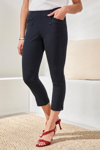 Yarn dye pinstripe stretch bengaline meets a slim cropped silhouette for a polished, modern look with effortless comfort. Designed with a pull on waistband, button accents, and subtle hem slits, these capris offer tailored ease perfect for travel days, office hours, or spring weekends on the go.