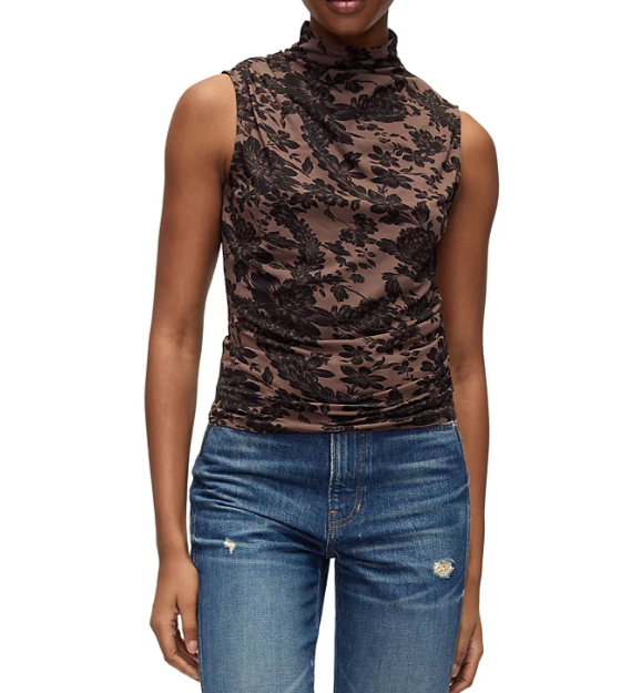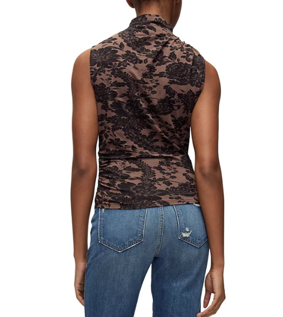 An essential, elevated. Crafted from a soft stretch blend in beige and black houndstooth, the Mylie reimagines the classic tank with a mock neckline and subtle side ruching. Its draped, sleeveless silhouette falls in soft folds, creating fluid, flattering shape. Wear it solo with jeans for a polished daytime look, or layer under a tailored suit for the office.