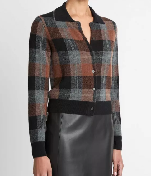 Checked Plaid Cashmere Polo Cardigan