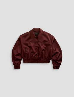 Channel the spirit of the frontier with Tana, your classic bomber crafted from heavyweight luxe satin fabrication in a deep cranberry color. Western yoke, spread collar, self-covered buttons. Applauded for its dramatic rounded sleeves, this jacket is detailed with elbow darts for comfort and a more tailored look.