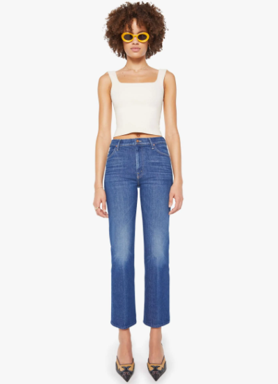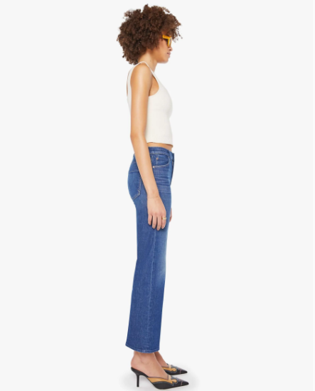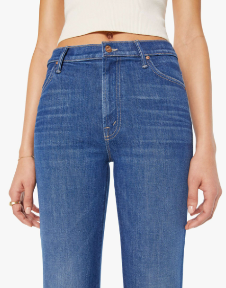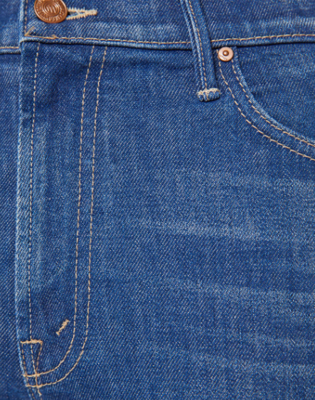 Off the grid. A high-rise straight leg jean with a zip fly, 28.25-inch inseam and a clean hem. Made from denim with a touch of stretch, Do Not Disturb is a mid-blue with whiskering and fading at the knee.
