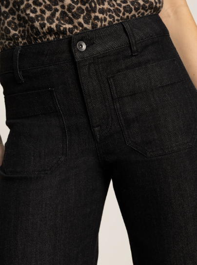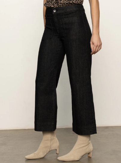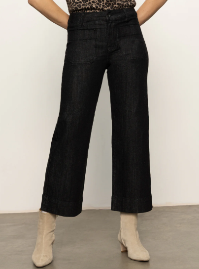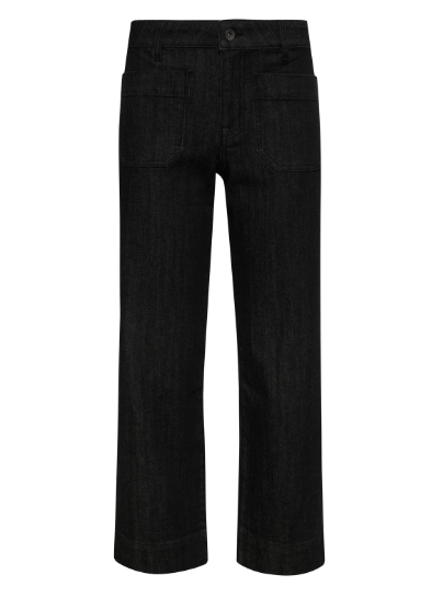 Patch pockets and abbreviated wide legs bring a '70s aesthetic to these dark-rinse jeans cut with a touch of comfy stretch.